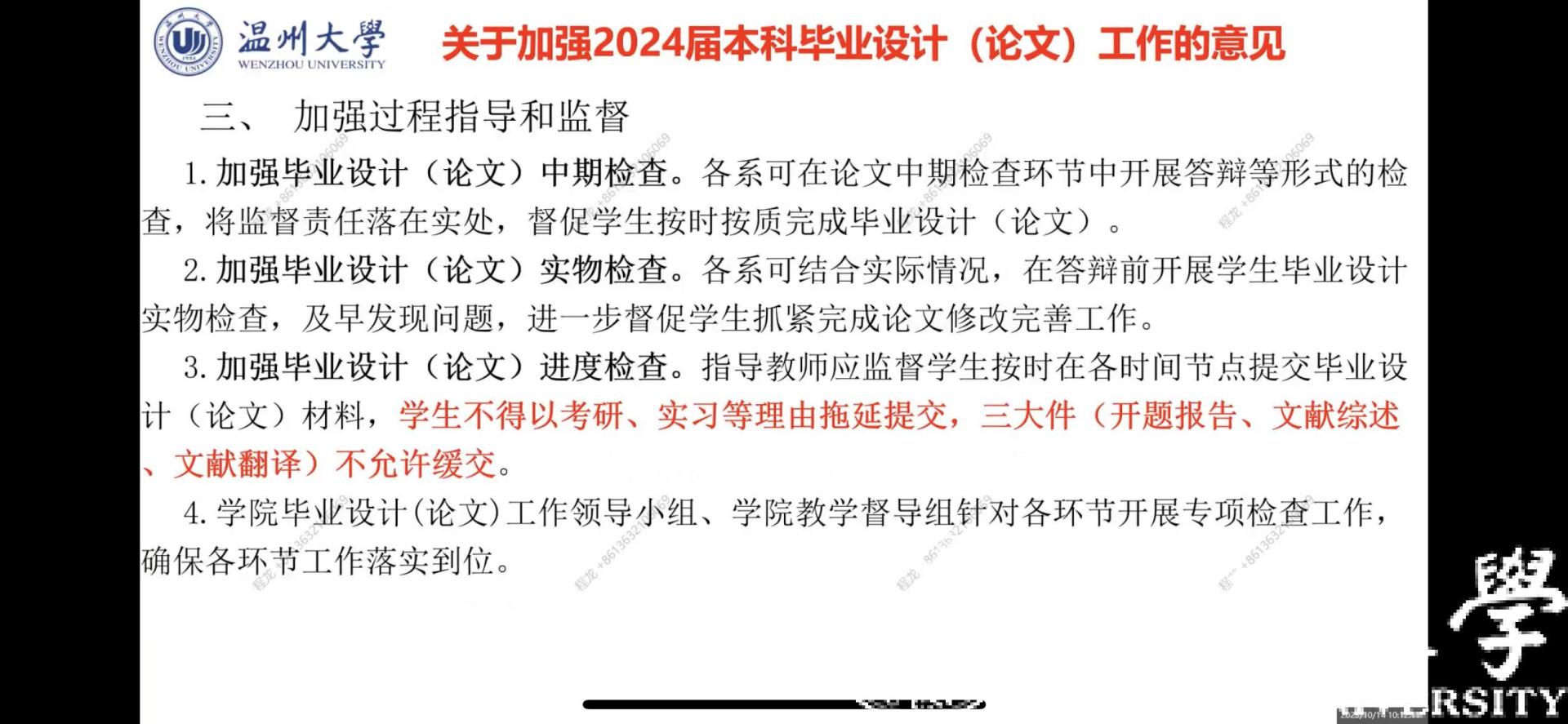 接着,经理助理程龙老师介绍了2024届本科毕业设计(论文)日程安排和基本要求,强调毕业设计的重要性与各个材料提交的时间节点;传达了公司《关于加强2024届本科毕业设计(论文)工作的意见》,提出要加强毕设过程指导和监督、开展专项检查工作、落实警告制度、严把答辩审查关,以此提醒各位同学不可懈怠,要重视各项毕业相关工作的要求和时限,提早规划,按时按质完成毕业设计。同时,要求各位指导老师要充分发挥员工的主动性和积极性,注重培养员工的创新能力和实践能力,及时对员工进行过程指导、检查和答疑,做好指导记录,确保员工毕业设计的进度和质量。