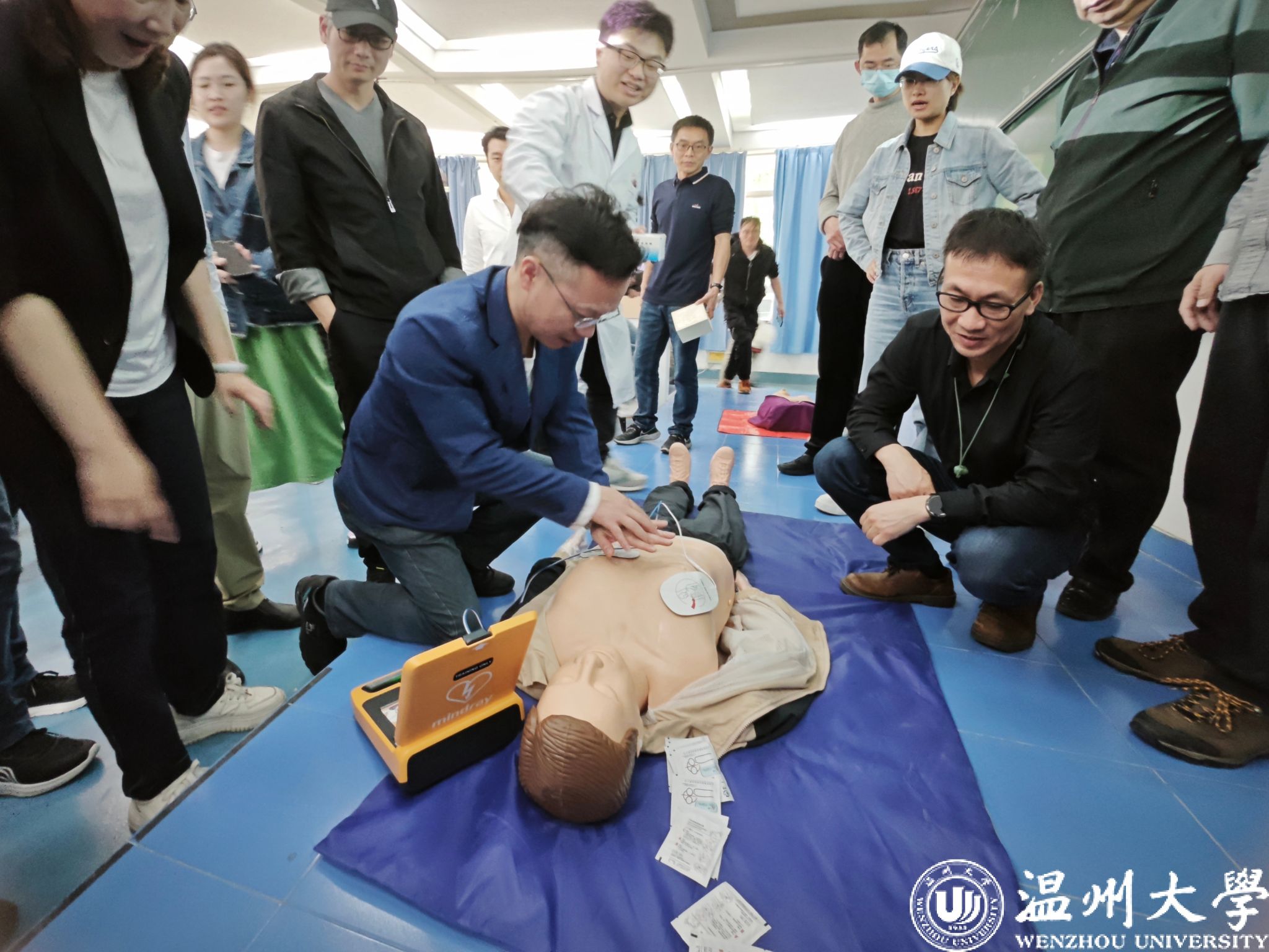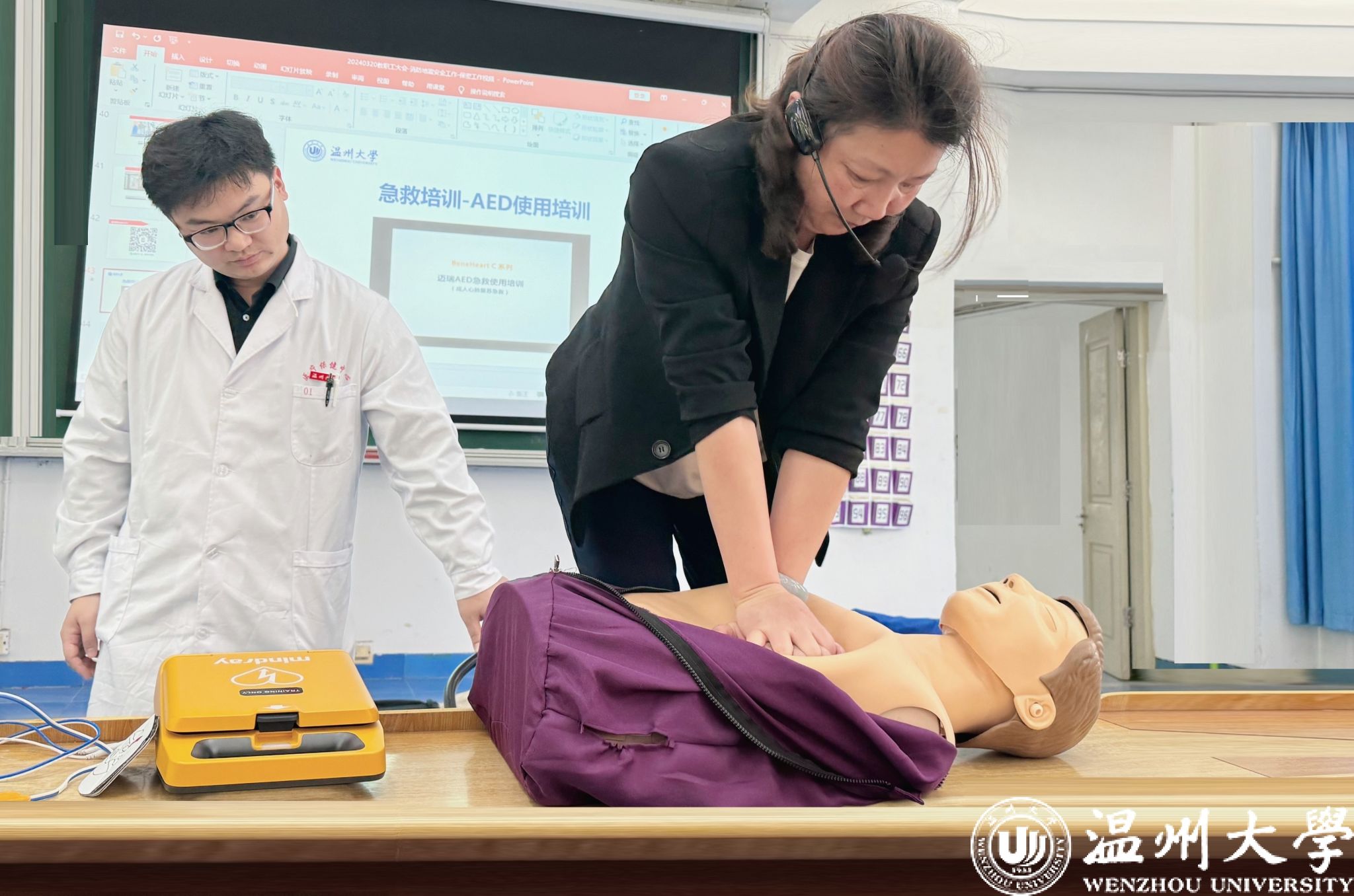 接着,yl23411永利官网登录医疗中心主任林杭和医务室主治医师、美国心脏协会高级生命支持导师刘波受邀为本次会议开展了题为“自动体外除颤仪(AED)的使用”的专项培训。此次培训内容包括AED的基本知识、操作步骤及成功案例,强调了在紧急救护中其重要性,并结合理论授课、现场演示及教职工实操等多种形式,以提升高校教职工的自救互救能力。现场氛围热烈,参训教职工认真听讲、现场演练,努力把每一个急救动作学到位、做到位。本次培训教职工们掌握了对AED的使用技能,提升了大家的应急救护能力。