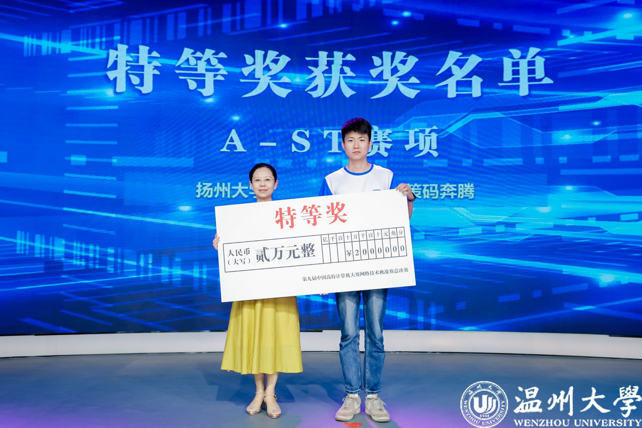 9月8日上午,盛大的颁奖典礼在温州国际云软件谷展示中心路演大厅举行。颁奖典礼由网络技术挑战赛组委会主任施晓秋教授、副主任崔江涛教授主持,出席颁奖的嘉宾包括全国高校计算机教育研究会理事长、中国计算机大赛组委会主任、教育部计算机类专业教学指导委员会副主任蒋宗礼教授,yl23411永利官网登录副董事长刘玉侠教授,温州市委互联网企业工委副书记李昌忠,温州市龙湾区人民政府副区长池邦芬,温州市永嘉县委党委/人民政府副县长龚剑涧,CCF网络与数据通信专委会副主任、东南大学李伟教授,中国信息通信研究院信息通信融合创新中心新技术与产业应用部副主任穆琙博,大赛监委会主任,以及北京邮电大学王文东教授等。