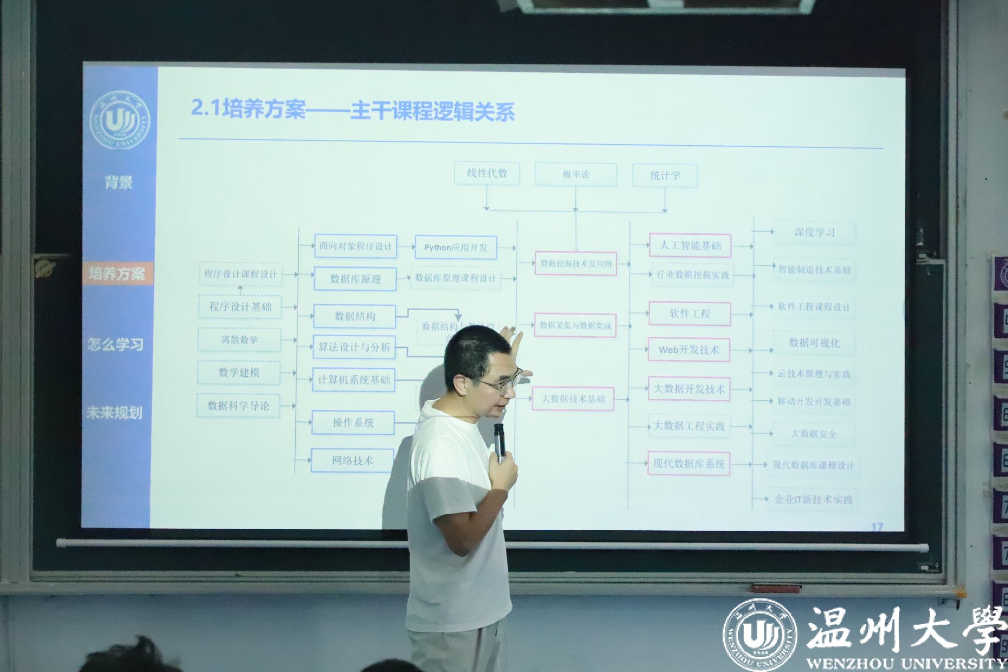 李洪老师为2024级新生们进行数据科学与大数据技术专业介绍。他从生产力与生产要素发展变革的历程出发,指出“数据”是第五生产要素,希望大家要从时代变革和国家安全的角度树立正确的数据安全观念。同时,他为2024级新生详细介绍培养方案内专业课程内容、课程建设逻辑架构和各类课程的学习方法,他指出,数据科学是以计算机科学技术为主导,融合数学和统计以及领域的业务知识的一门学科,公司依托大数据研究院、浙江省重点实验室等平台,开展深度融合的“产学研用”一体化人才培养模式,为2024级新生未来的考研或就业之路提供扎实的基础,并希望同学们能够利用好学习资源,实现自身学习目标。
