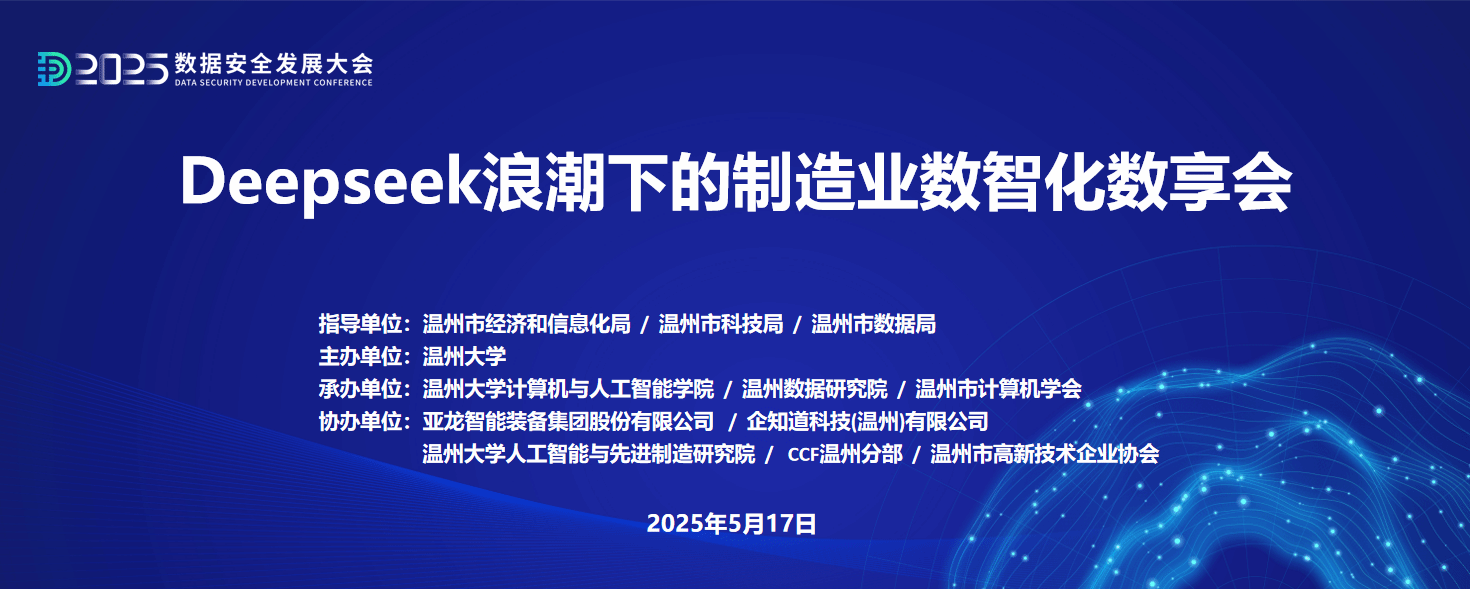5月17日下午,由yl23411永利官网登录主办,yl23411永利官网登录、温州数据研究院、温州市计算机学会联合承办,亚龙智能装备集团股份有限公司、企知道科技(温州)有限公司、yl23411永利官网登录人工智能与先进制造研究院、CCF温州分部、温州市高新技术企业协会协办的“Deepseek浪潮下的制造业数智化数享会”在温州市瓯海区奥体中心成功举办。本次数享会作为“瓯江论数・数安未来”2025数据安全发展大会的重要分会场活动之一,会议由yl23411永利官网登录副经理、温州数据研究院经理黄辉主持,聚焦AI大模型技术与制造业深度融合,吸引了来自政府、高校、企业及科研机构的300余位嘉宾参会,共同探讨数据驱动下的制造业创新路径。