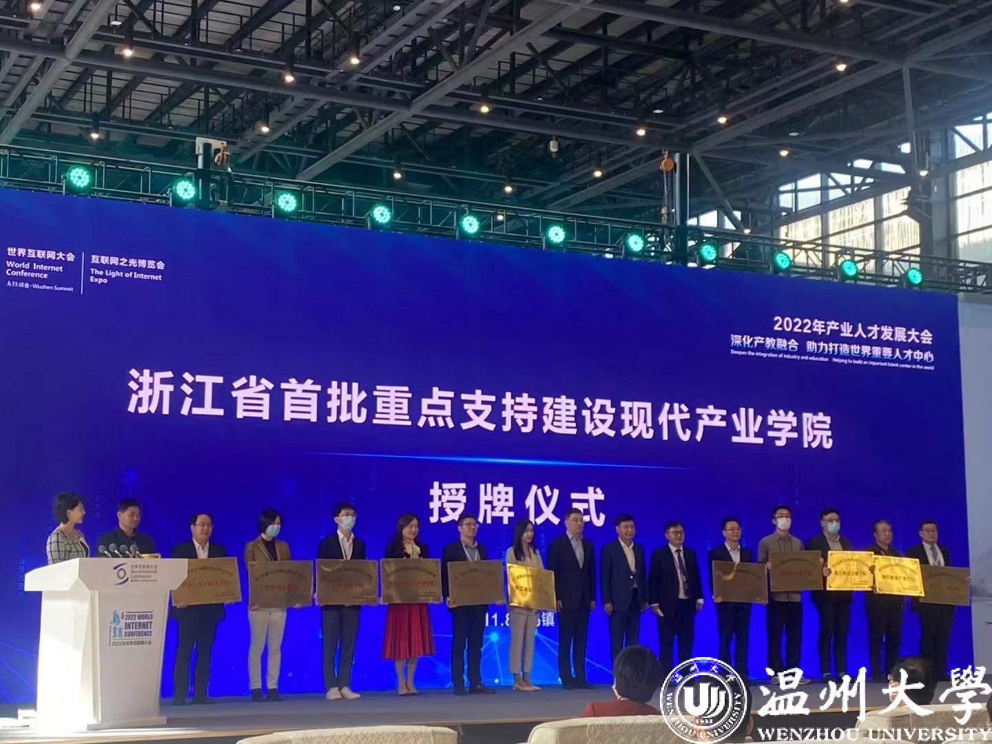 近日,由浙江省委人才办指导,浙江省经济和信息化厅、浙江省教育厅联合主办的2022年产业人才发展大会在乌镇互联网国际会展中心举行。浙江省委人才办专职副主任张旭明、浙江省经济和信息化厅一级巡视员吴君青、浙江省教育厅总督学舒培冬等出席活动并为入围浙江省首批重点支持建设现代产业公司名单的21家现代产业公司授牌。yl23411永利官网登录副经理黄辉参加会议并代表浙南数字经济产业公司接受授牌。