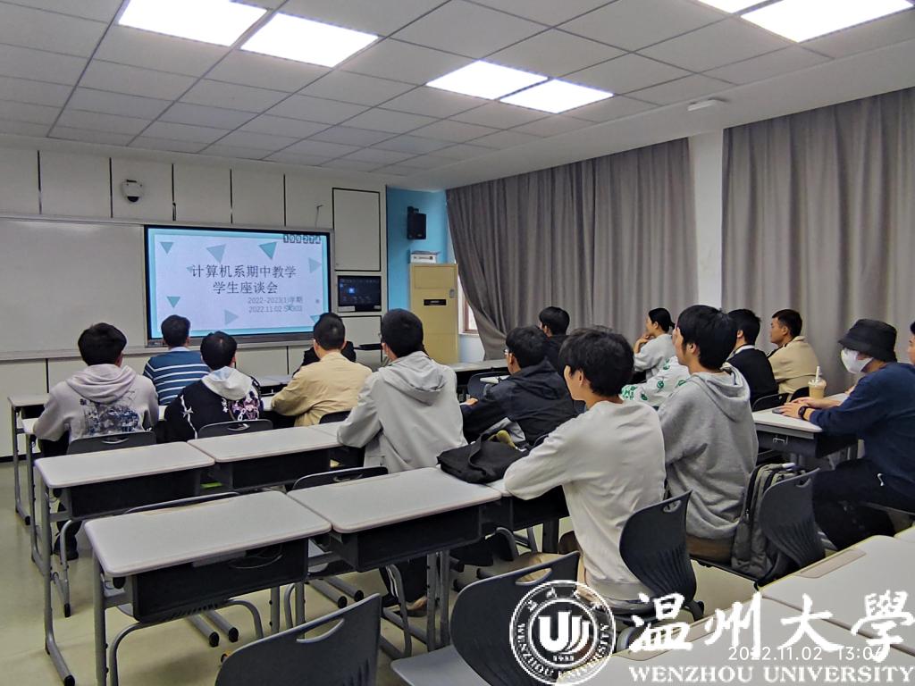 为进一步了解本学期员工学习状况,加强教学管理,提升教学质量,促进师生沟通,2022年11月02日下午1点,计算机系在5A303教室召开了本学期期中师生座谈会,参加座谈会的有陈伟斌老师、芦明老师、林小燕老师、邓若曦老师,以及19~22级计算机专业的班委和员工代表近20名同学,会议由计算机系主任陈伟斌老师主持。