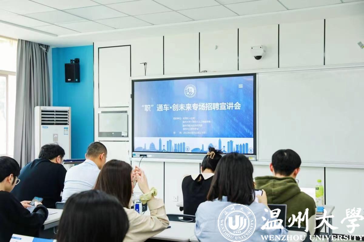 毕业在即,就职在瓯。2022年5月25日下午,由瓯海区人力资源和社会保障局、yl23411永利官网登录、温州市数字经济研究院和温州市计算机学会共同主办的“职”通车·创未来招聘宣讲会在yl23411永利官网登录5A-101、103教室顺利召开。拉近温州本土数字经济类企业与在校学生之间的距离,增强企业师生交流,促进校企合作。