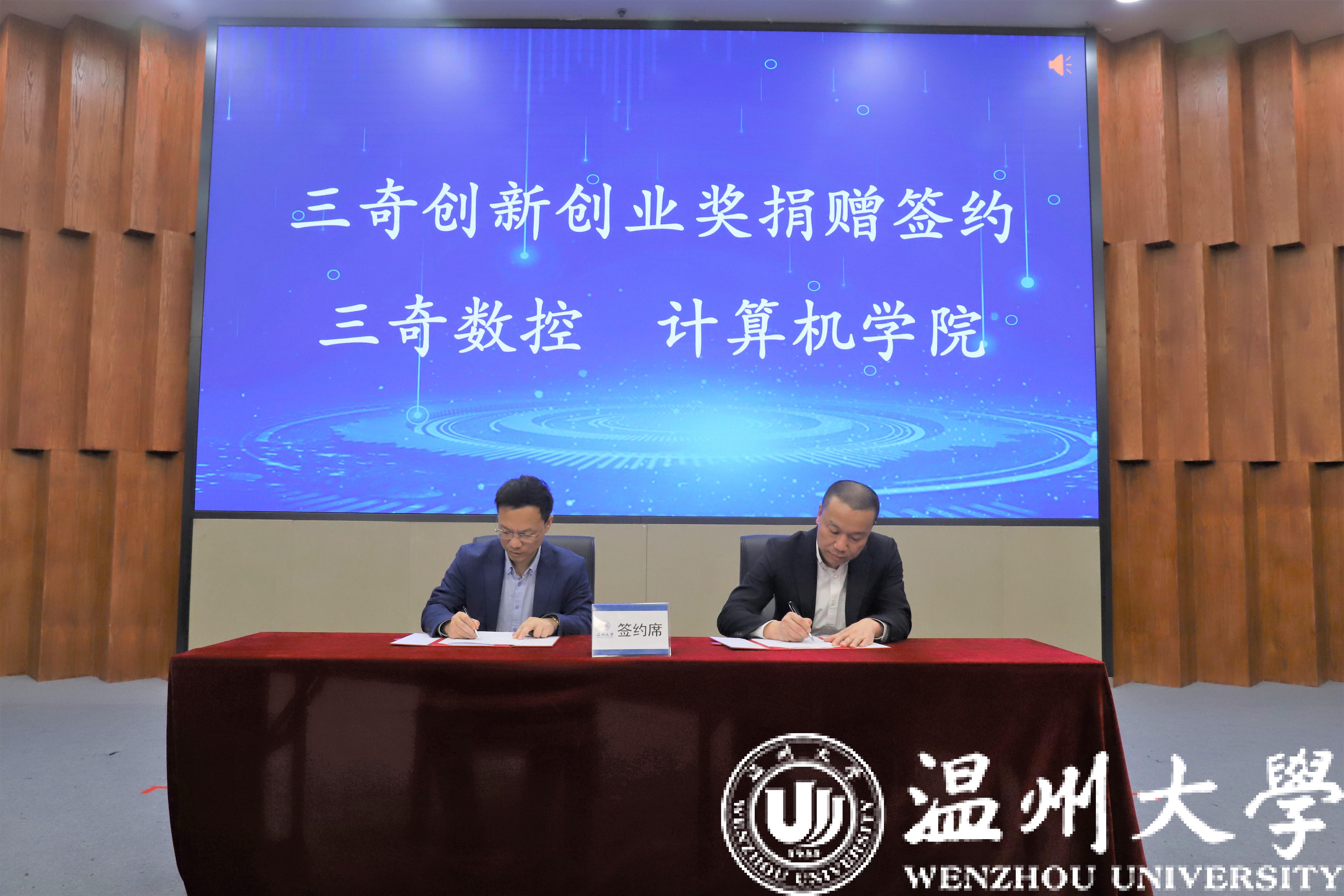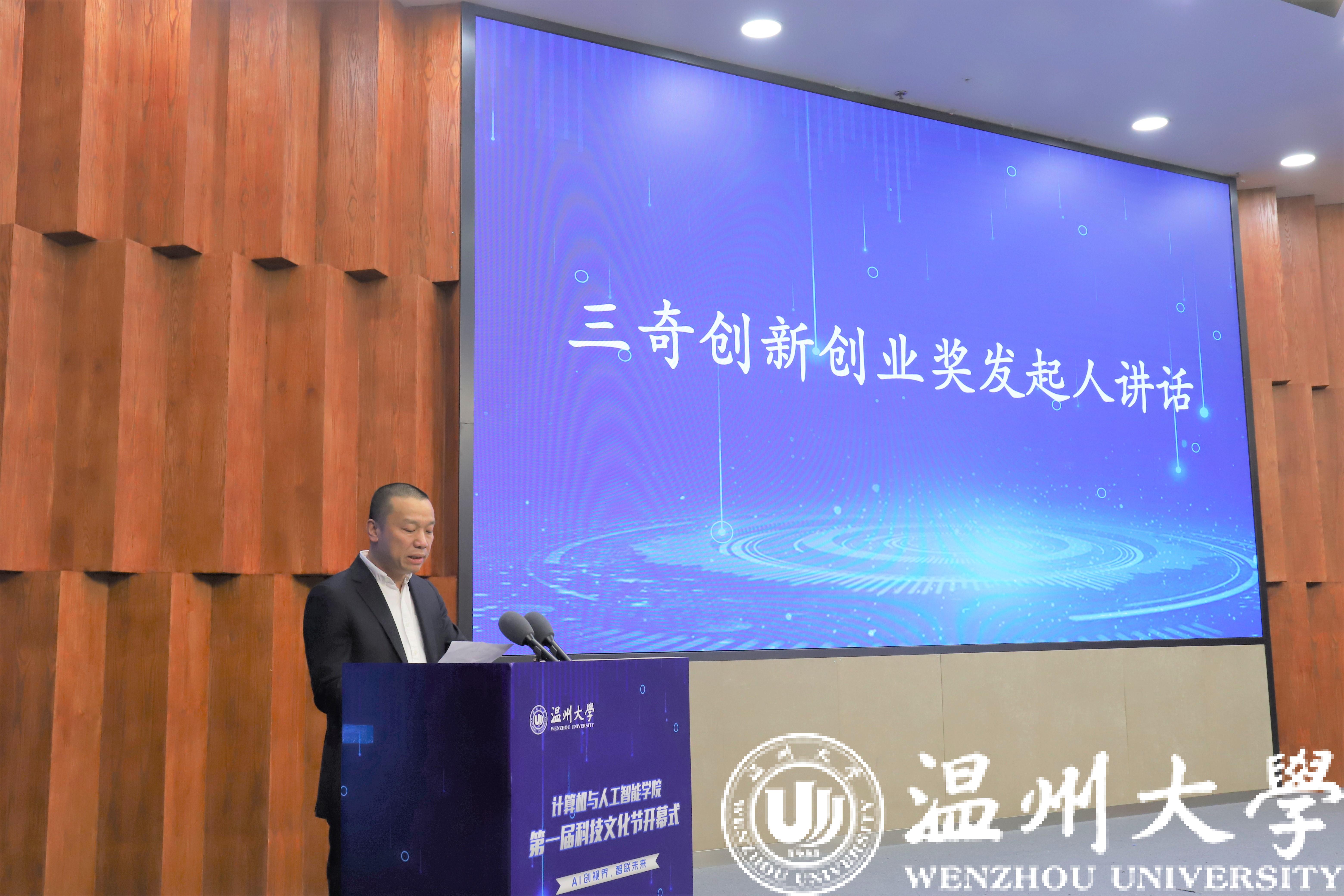 随后进行了员工基金签约仪式。为鼓励全院师生参与学科竞赛及创新创业,浙江三奇机械设备有限公司特此设立了三奇创新创业奖学金。同时,对经过公司层层筛选最后脱颖而出的三支AI创空间入驻团队设立了资助培育奖金。在为三支入驻团队颁发奖金之后,郑总发表讲话,他向同学们讲解了人工智能与大数据技术领域在工业中的实际应用,鼓励同学们大胆创新,并表达了对同学们的殷切期盼。