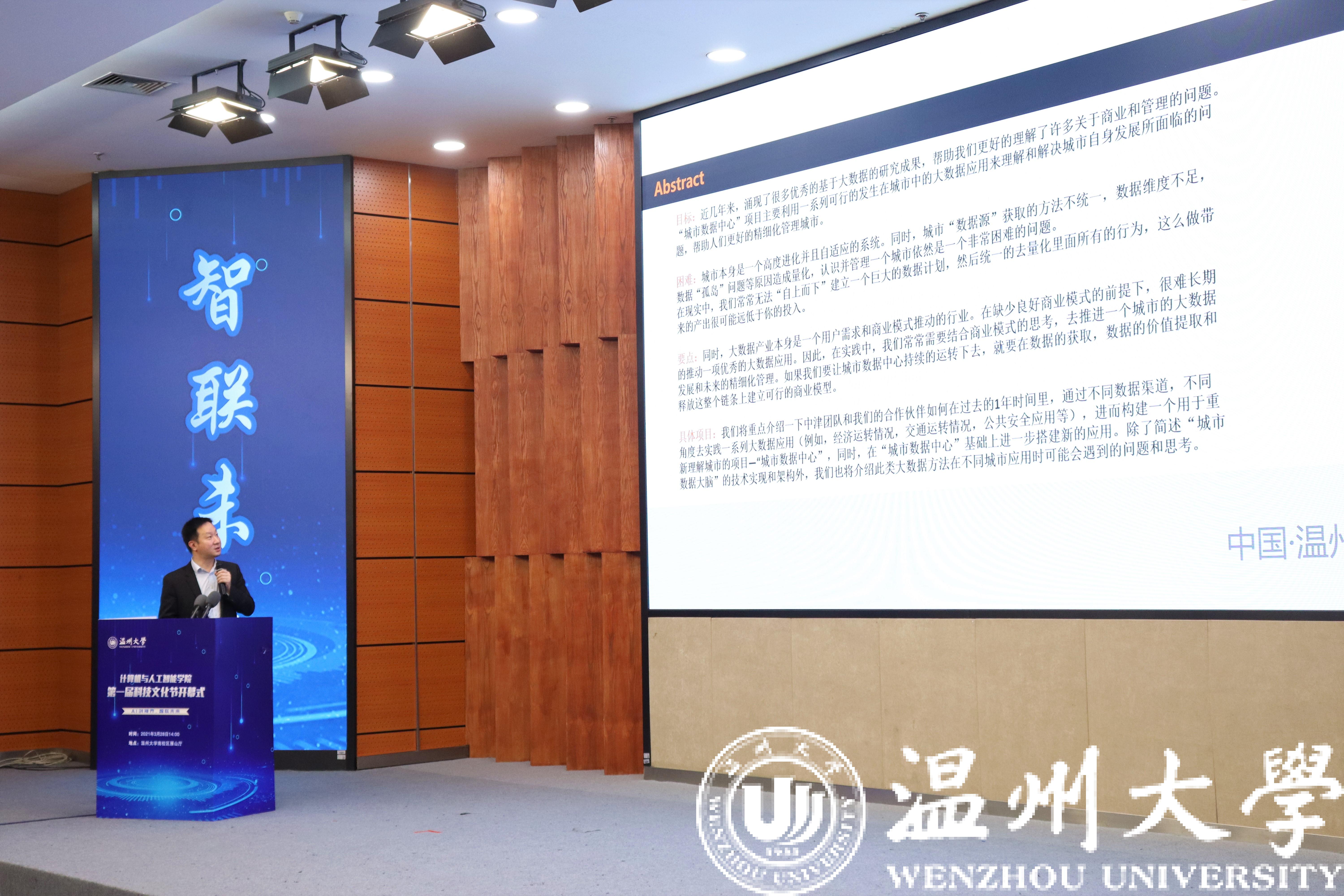 紧接着,温州中津先进科技研究院王振宇经理做《人工智能与大数据应用》的专题讲座。在讲座中,王经理主要讲解了“一个基于大数据方法的城市精细化管理计划的探讨”,并以“中国电子商务大数据统计监测体系”、“区域教育大数据项目”、“城市出租车大数据项目”等项目为例,为同学们讲解了人工智能与大数据技术在不同领域的应用和未来发展方向。进入互动环节,王经理耐心生动地解答了同学们提出的问题,为同学们在人工智能和大数据的探索求知之旅上指明了前进的方向。至此,本次科技文化节开幕式圆满结束。