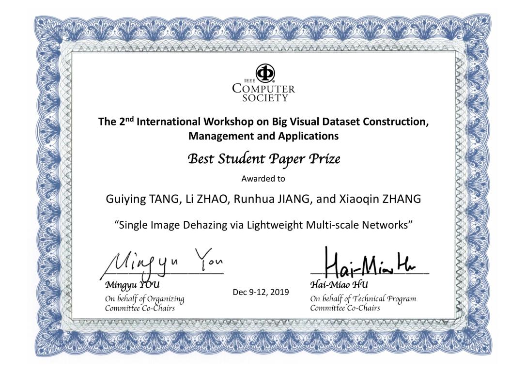 近日,在洛杉矶召开的第二届国际视觉大数据构建、管理与应用会议中,公司yl23411永利官网登录张笑钦教授指导的研究生唐贵英、蒋润华的论文《Single Image Dehazing via Lightweight Multi-scale Networks》从众多文章中脱颖而出,获得大会颁发的最佳员工论文奖。