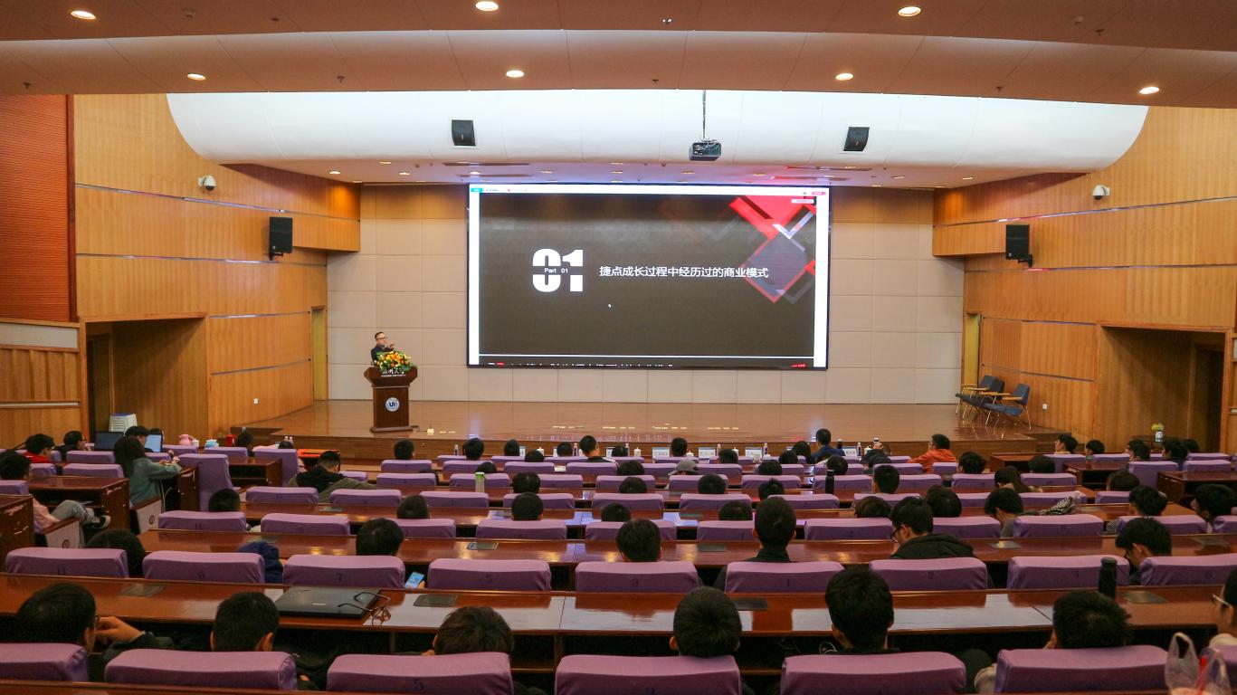 第一阶段的嘉宾分享环节由张良玉拉开序幕。张良玉员工以《掌上大学Story&Style》为主题,从掌上大学起源、起伏、现在三个时间维度进行分享介绍,他以一路走来的点滴创业故事勉励同学坚守初心是信仰,追求本质是能力,全力以赴是态度。随后,兰一辉员工以《商业模式与短视频》为主题进行了生动的演讲。兰一辉以捷点成长过程中经历过的商业模式为切入点,就自己15年以来创业背景下对互联网+时代市场现状及行业前景进行了探讨,刷新了在场师生对商业模式与短视频的认识。