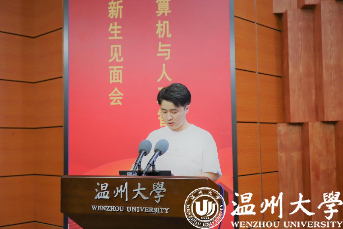 20人工智能新生代表沈益威作为新生代表上台发言。“求学问是,敢为人先。东海之滨,育人之堂。”表达了他对温大的向往与老员工活的憧憬。面对这一幅崭新的人生画卷,他提出三点:学会鞭策自己,践行青春梦想;励志向上向善,坚守生命本真;保持乐观心态,培育责任担当。最后,他呼吁全体新生在担当中历练,在尽责中成长,用青春和活力去谱写属于自己的大学新时代。