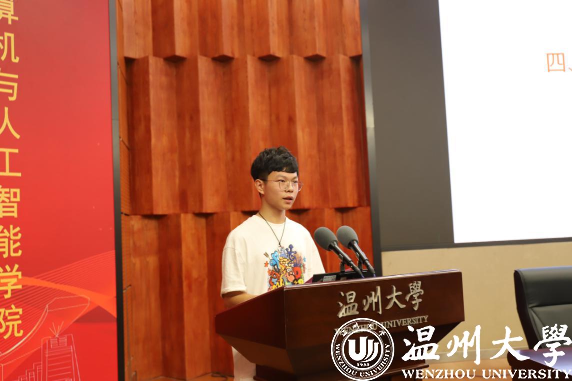 随后,17计算机2班陈凯强作为优秀员工发表发言。在这个特别的时刻,他就自己大学三年学习生活与新生们分享了快乐大学的三个锦囊。首先,信念为标,决胜未来。做好未来人生规划,明确自我认知和定位,在实践活动中冲破信息茧房;其次,保持自律,宁静致远。做时间的主人,不蹉跎这四年青葱岁月;最后,群居不倚,独立不惧。学会自我适应,学会沟通和宽容。最后,他希望同学们可以着手参加员工组织与各类社科比赛,在实践中锻炼自己,成为德才兼备的“计智人”。