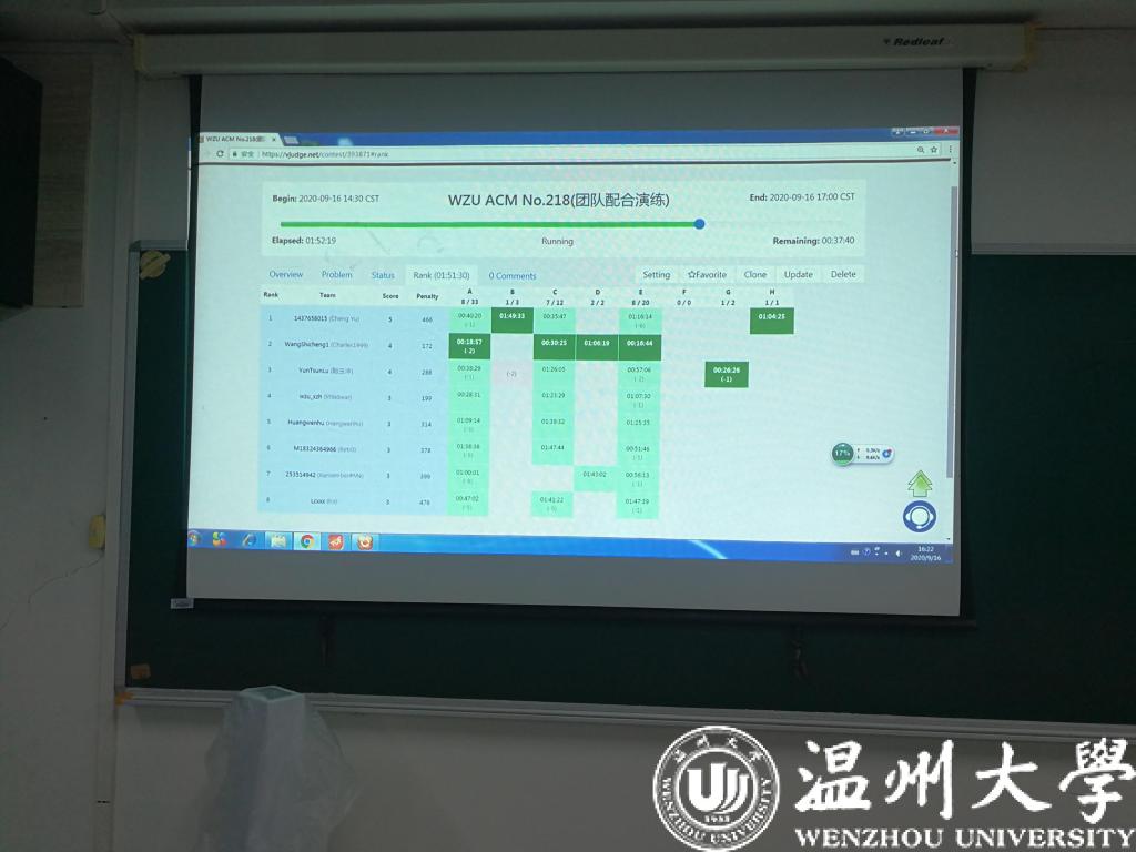 由于新冠肺炎疫情的影响, 原定4月份举行的浙江省赛推迟到10月17日在线上举行。我们通过ACM校赛成绩和集训队平时表现,选拔组织了6支参赛队伍,外加1支候补队、1支自由组合邀请队,每队3人。参赛队员暑假期间进行了十余场个人能力训练,开学后立即开始团队合作训练。这场演练是本届省赛队伍的首场团队演练,旨在熟悉竞赛的视频监考系统OMS的使用,并尽早发现队伍在团队合作上可能出现的心态、技术和管理问题,为更好地参加省赛做好准备。