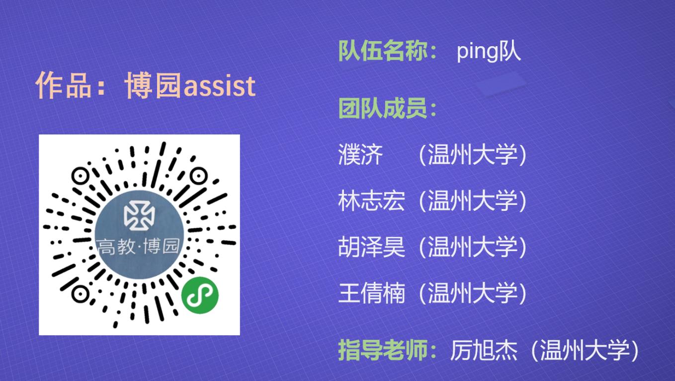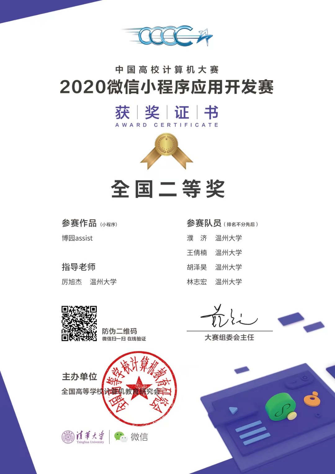 8月15-16日,“2020中国高校计算机大赛——微信小程序应用开发赛决赛”全国总决赛圆满落幕。来自全国七大赛区15252人、4314支队伍经过激烈的角逐,最终由32支队伍入围全国总决赛。公司yl23411永利官网登录厉旭杰老师指导的濮济、王倩楠、胡泽昊、林志宏四位同学组成的员工团队“ping队”,在比赛中沉着应战,科学决策,凭借“博园assist”项目斩获全国总决赛二等奖的优秀成绩。