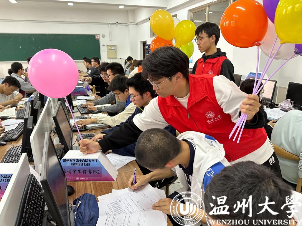 比赛现场,别具风格的队名展现出温大学子独特的创意!每答对一题便可获得气球插在相应队旗上,这既清晰体现了比赛队伍的答题数量,又增添了比赛现场的趣味性。在各队成员相互沟通与合作下,选手们认真完成了题目的解答,展露出作为新时代信息英才所具备的高素养与新思维。最终本次大赛共评出特等奖和最佳女队奖各1队,一等奖11队,二等奖21队,三等奖36队。