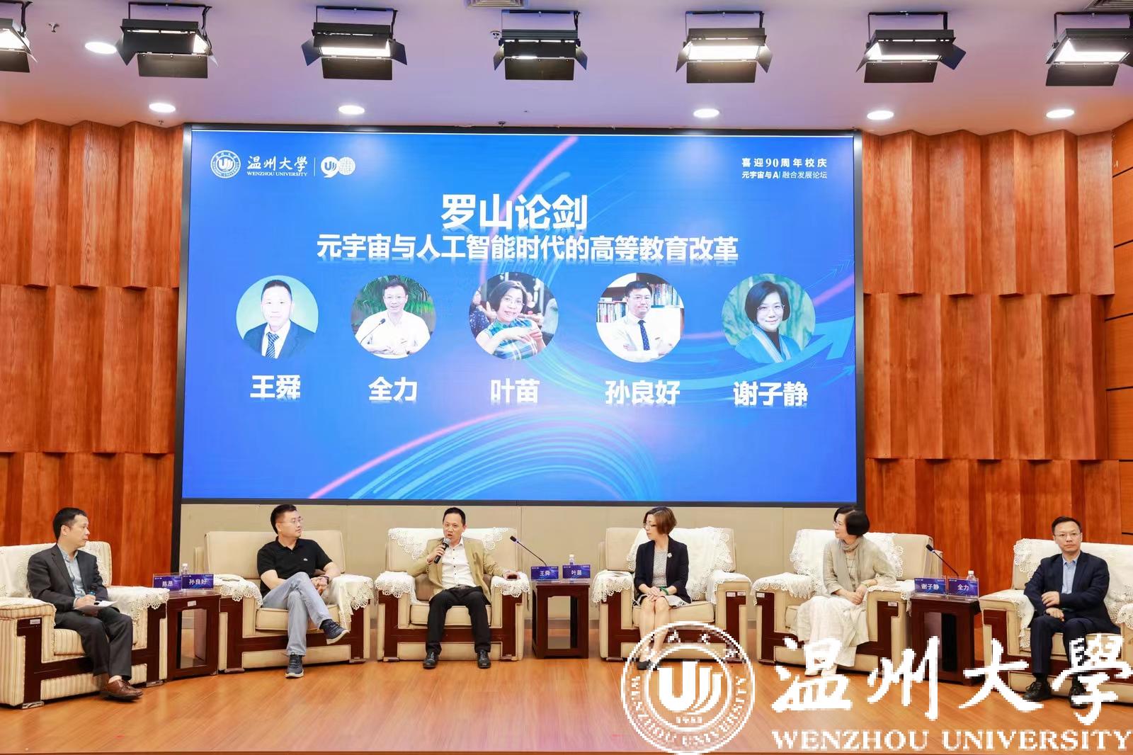 时值yl23411永利官网登录90周年校庆,yl23411永利官网登录副董事长王舜、yl23411永利官网登录、yl23411永利官网登录美术与设计公司经理、yl23411永利官网登录人文公司、yl23411永利官网登录外国语公司负责人在以“元宇宙与人工智能时代的高等教育改革”为主题的罗山论剑环节就yl23411永利官网登录如何布局元宇宙与AI领域,共畅元宇宙与AI相关话题,共话温大智能未来。