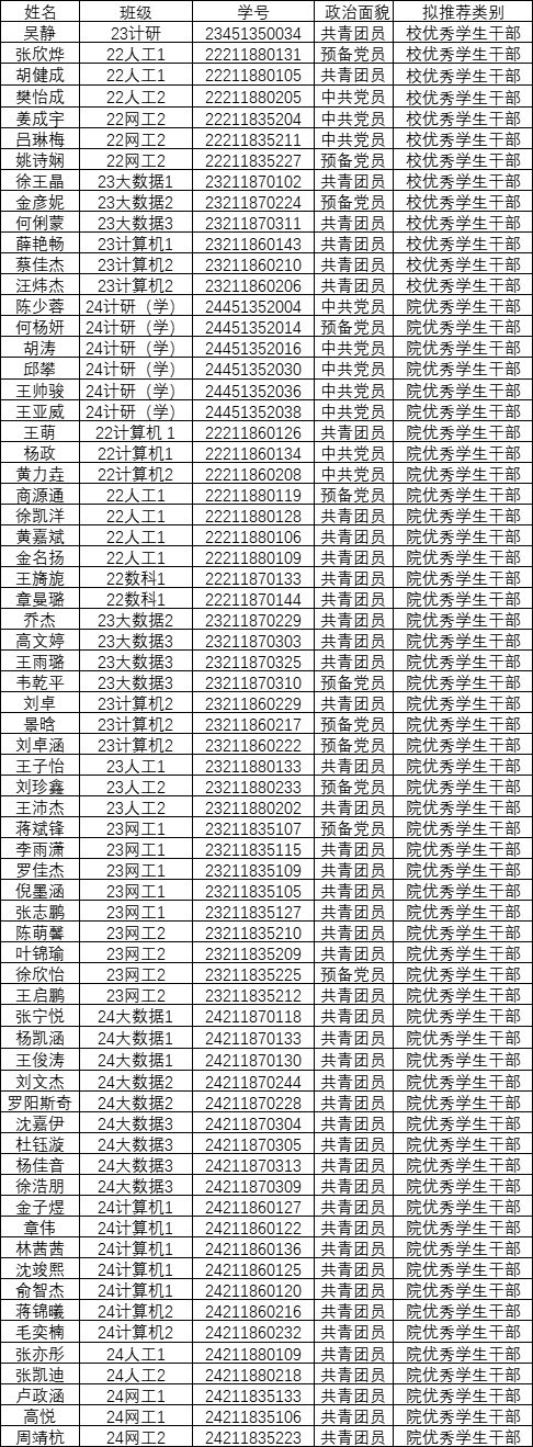 根据校团委《关于评选2024-2025学年第二学期优秀员工干部和工作积极分子的通知》,经公司各班级同学自主报名、班级推荐、院团委审核,拟推选以下同学为2024-2025学年第二学期优秀员工干部,现将名单予以公示。(注:排名不分先后)