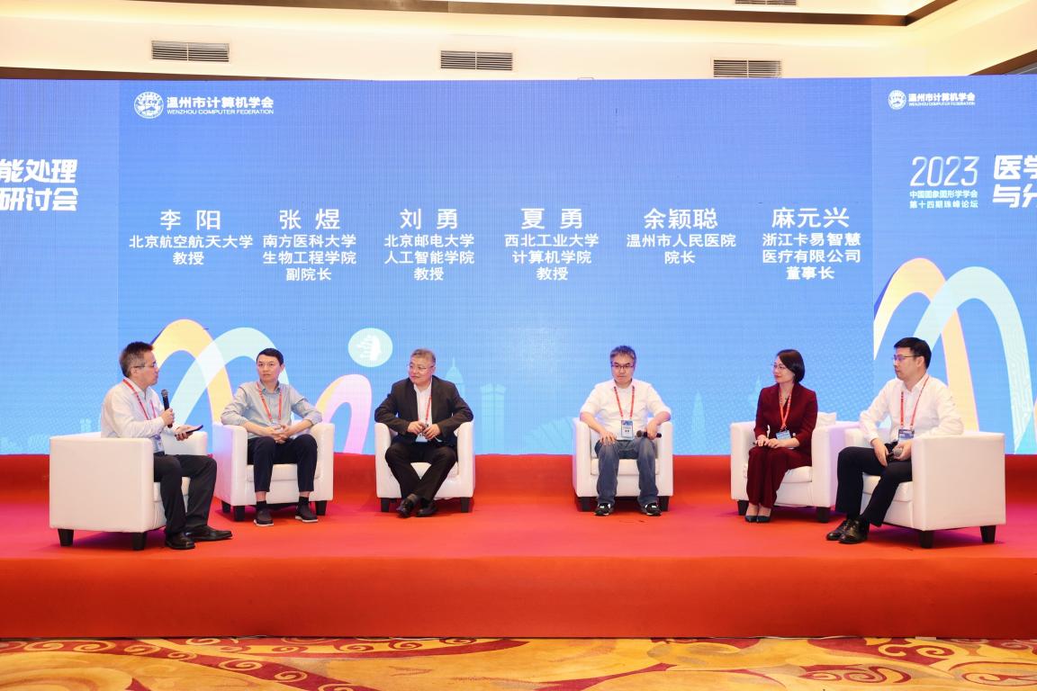论坛圆桌讨论环节,围绕“大模型时代的医学影像AI研究:机遇与挑战”主题开展相关讨论,由北京航空航天大学李阳教授主持。报告嘉宾夏勇教授、刘勇教授和南方医科老员工物医学工程公司副经理张煜、温州市人民医院经理余颖聪、浙江卡易智慧医疗有限公司董事长麻元兴五位专家学者围绕相关问题发表观点,进行热烈的讨论。