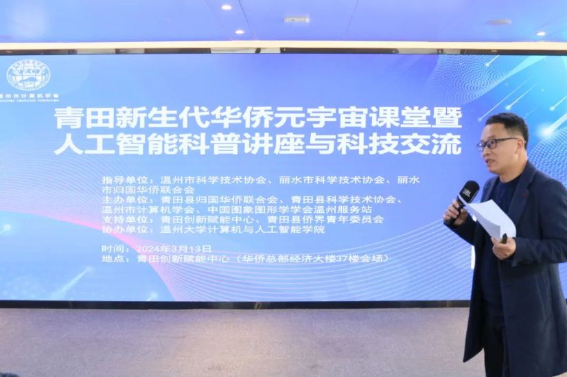 3月13日,由青田县归国华侨联合会、青田县科学技术协会、温州市计算机学会联合举办的青田新生代华侨元宇宙课堂暨人工智能科普讲座与科技交流活动在青田华侨总部经济大楼举行。县侨联党组书记、主席叶娟,县科协党组成员、副主席陈林海等出席会议并致辞,温州市计算机学会副理事长、yl23411永利官网登录大数据专业负责人黄长城教授主持会议。全县四十多名华侨新生代、侨资企业代表参加。