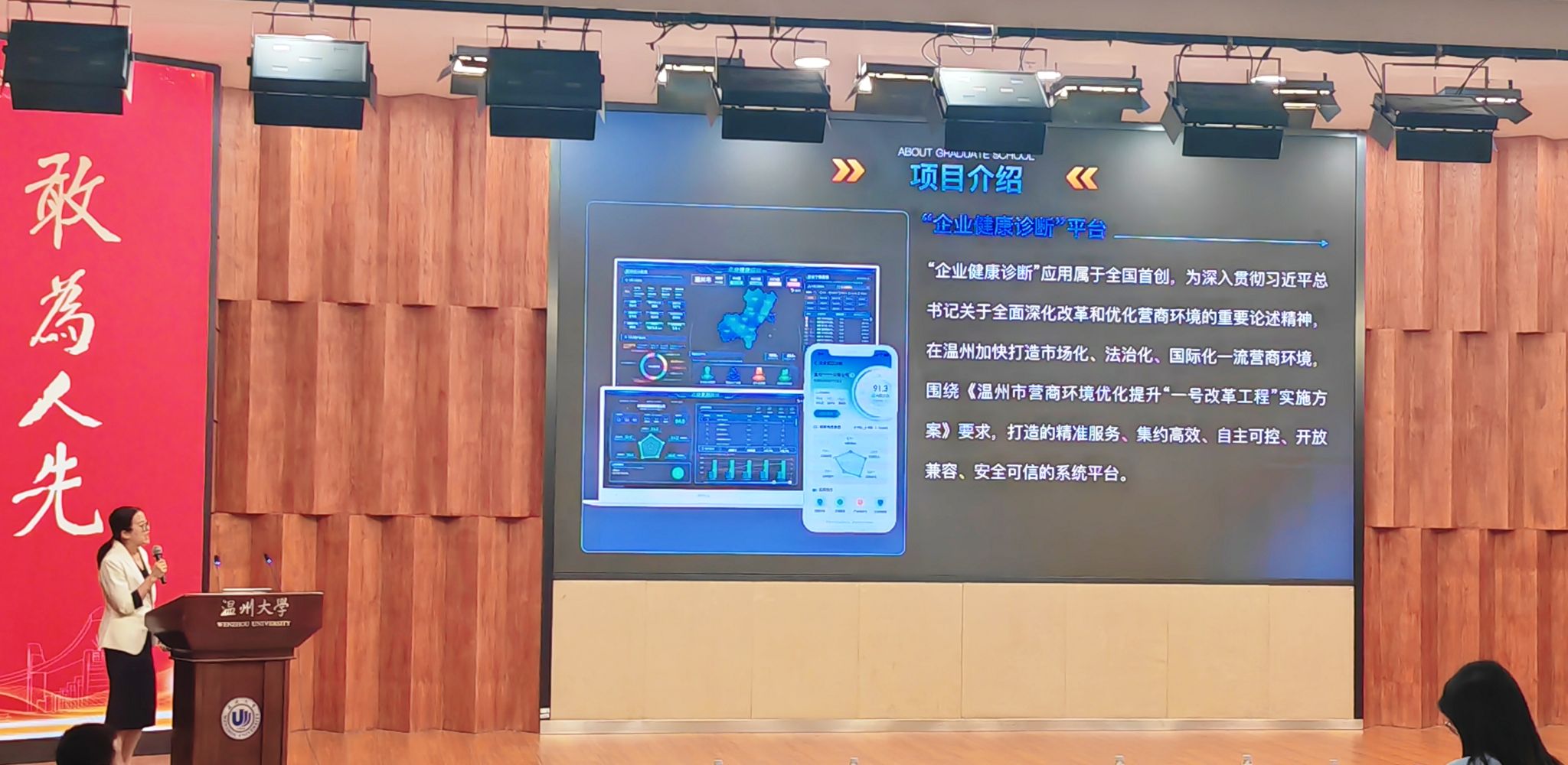 在yl23411永利官网登录服务温州高质量发展项目签约推介会上,大数据与信息技术研究院副经理陈丽燕现场演示了全国首创的“黑科技”成果“企业健康诊断系统”项目。“项目通过深度分析企业的生产经营数据,为企业提供科学的决策支持,帮助企业定位问题、优化管理流程,提升运营效率。我们围绕经营活力、创新驱动、质效提升、结构优化、风险防范五个方面,建立了健康评价算法池,与经信、市监、大数据等部门互动,实现省、市、县、乡、网格五级贯通,初步形成企业数据‘分析-预警-体检-诊治-监调’的全生命周期工作闭环。”陈丽燕进一步介绍,“企业健康诊断系统”项目还可以动态掌握区域经济情况、微观经济画像和个体企业发展情况,对苗头性问题实行预警,助力政府部门精准施策。