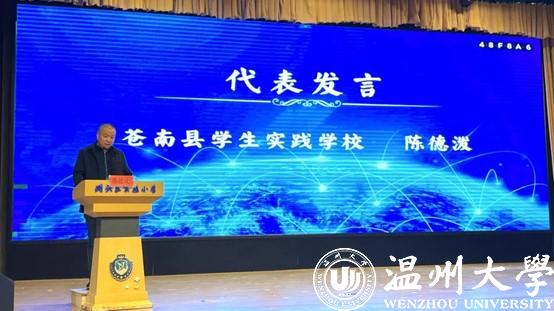 苍南县员工实践公司陈德泼老师做代表发言,他介绍到,今年是苍南“爱创客”指导团成立的第七个年头。七年里,“爱创客”指导团在一群有爱、上进、充满活力的老师们努力下,在苍南县教育局领导的支持下走到了今天,为三十几所公司播种下了创客种子,发布了6个系列课程、多个线上直播课堂,牵头申报多个课题,获得温州市一二等奖。今天,也是温州“AI创客”指导团成立的第一年。从县域到市域,变的是区域,不变的是在这个更庞大的团队中,一起热爱、一起抱团、一起成长。