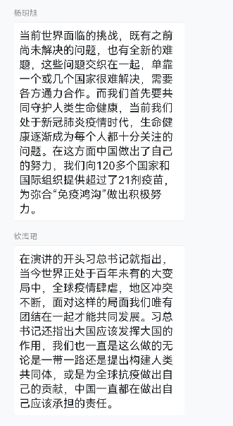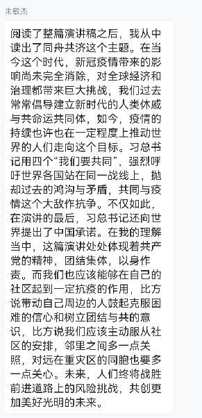 其他同志也纷纷发表了自己的感想与体会,通过文字的形式分享给大家一同交流学习。通过本次分享学习习近平总书记的主旨演讲,我们更深刻地认识到新冠疫情犹存、经济复苏乏力、地缘政治复杂,世界正站在新的十字路口的局势。“世界之变、时代之变、历史之变正以前所未有的方式展开,给人类提出了必须严肃对待的挑战。
