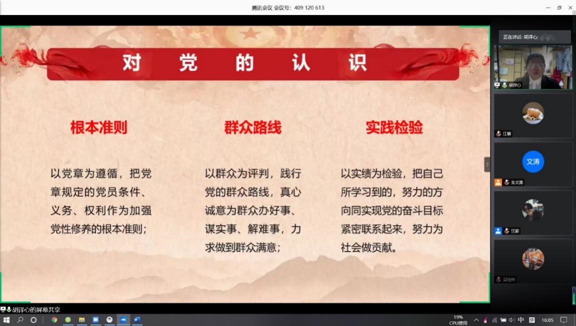 答辩会上,各位入党积极分子以视频和共享屏幕的形式就本人履历、对党的认识、入党动机、在校表现及生活作风等方面向党组织汇报,并在问答环节中,就党的基本理论知识、时事政治看法等方面进行了阐述,不仅展现出青年员工的朝气与活力,还体现出良好的党性修养与较高的思想觉悟。在线的辅导员老师、员工党员等也对各候选人的回答做出纠正及补充,并寄予殷切期盼。