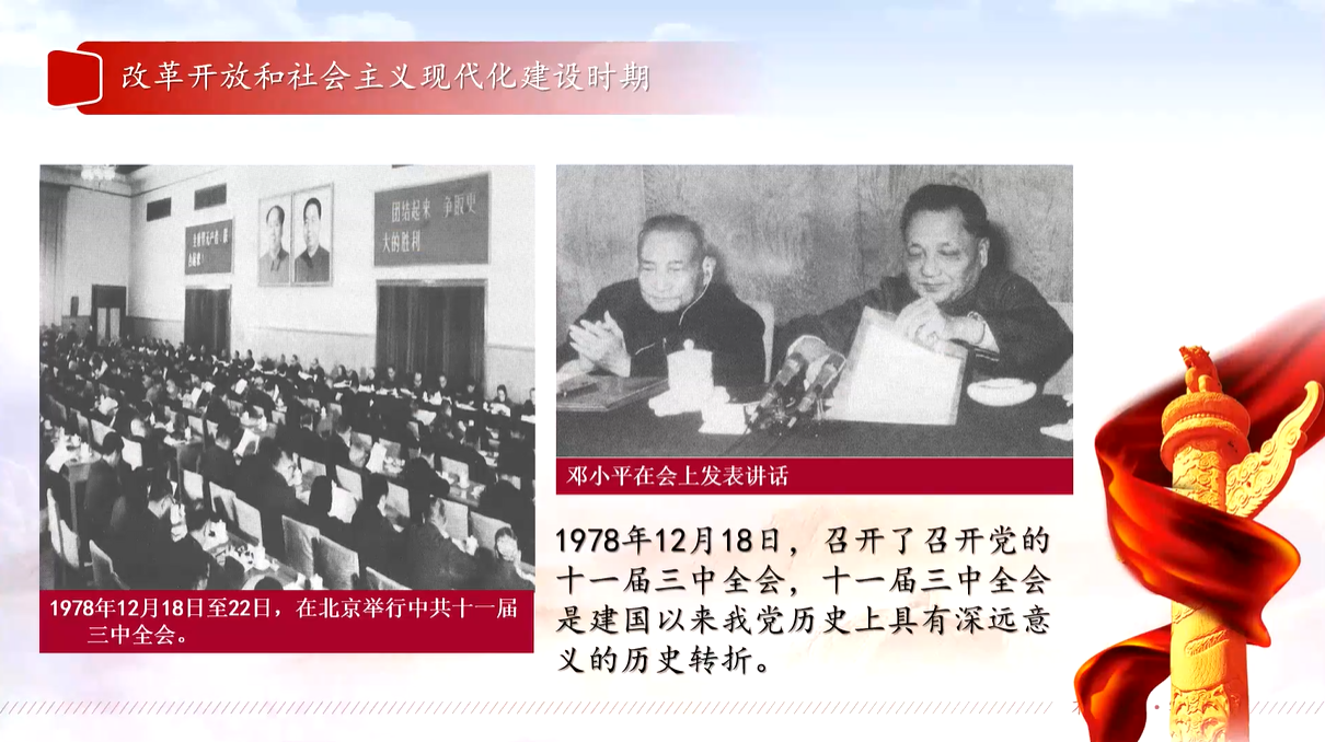 唐静同志分享的是1971年至1980年的改革开放和社会主义现代化建设。1978年在北京举行的中国共产党十一届三中全会是建国以来我党历史上具有深远意义的转折。同时她还展示了一段视频, 40年前的十一届三中全会如一声春雷惊醒了沉睡中的东方雄狮。改革让神州大地迸发出了勃勃生机,开放使封闭的中国拥抱整个世界。