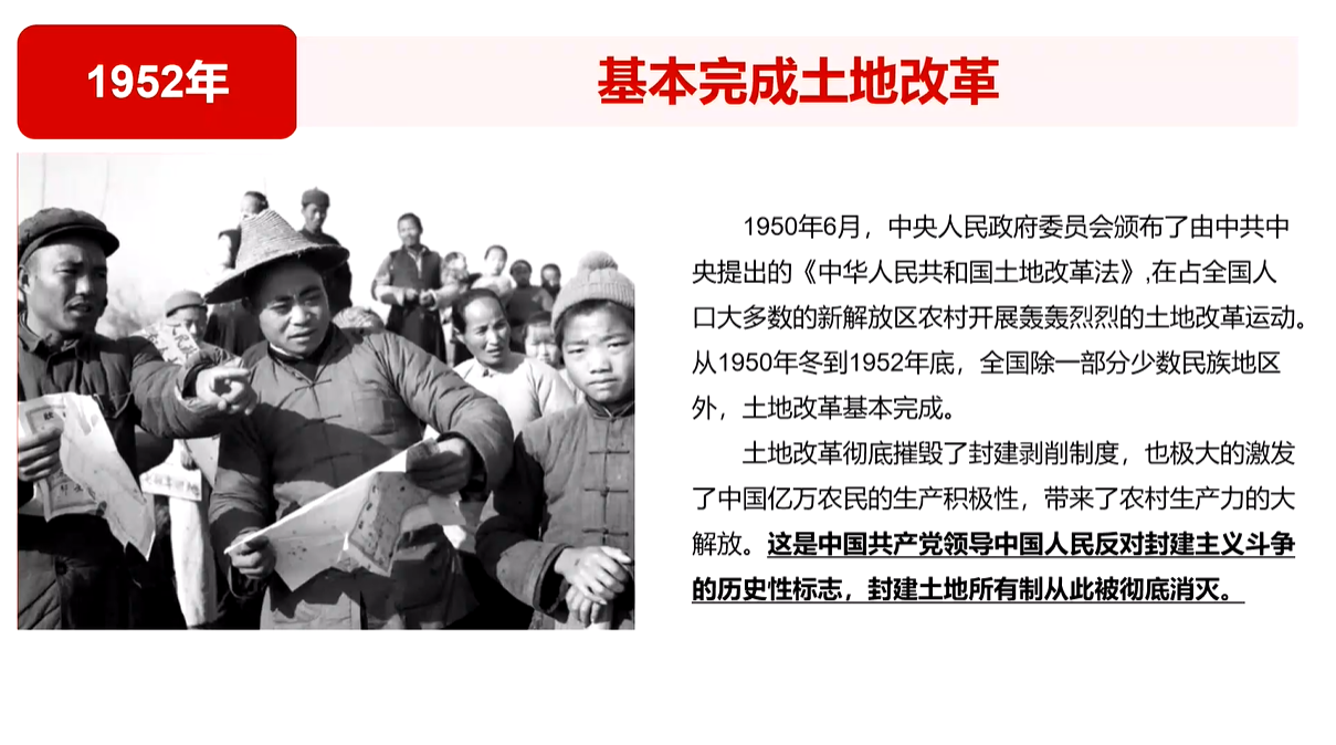 张巧凤同志讲述了1950-1960年大事——土地改革。到1952年底,全国除一部分的少数民族地区外,土地改革基本完成,土地改革彻底摧毁了封建剥削制度,也极大地激发了中国亿万农民的生产积极性,这是中国共产党领导中国人民反对封建主义斗争的历史性标志,从此封建土地所有制被彻底消灭。