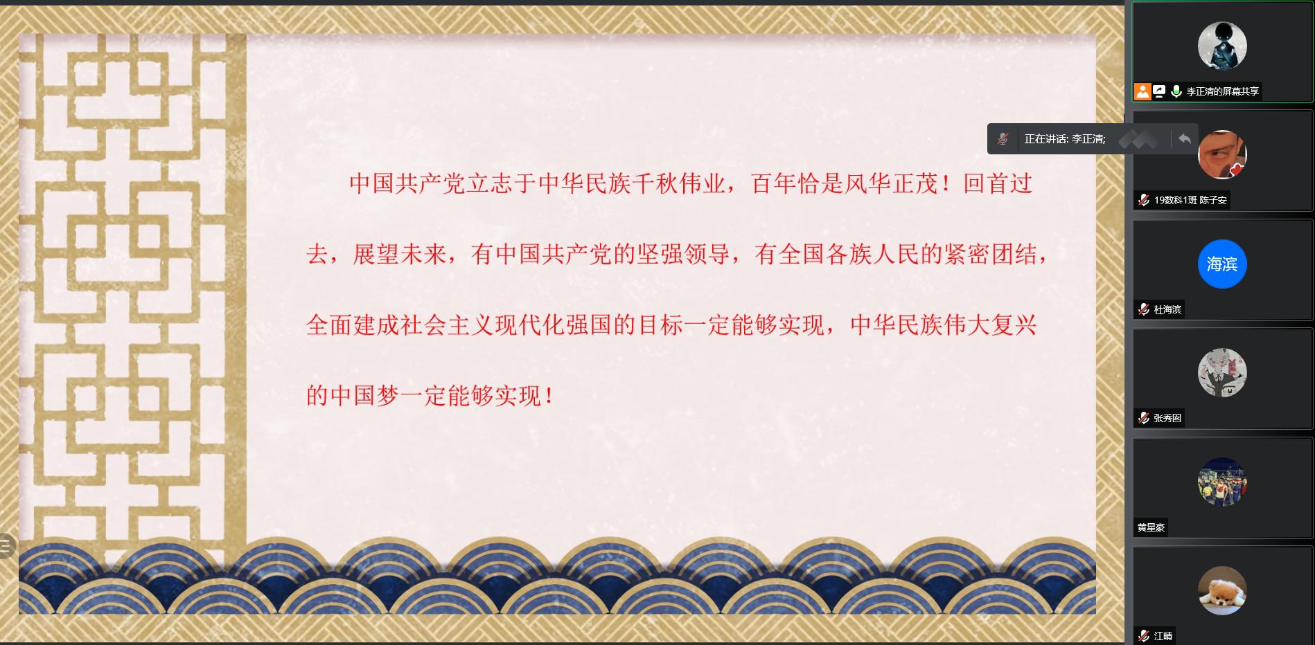 为认真学习贯彻习近平总书记在庆祝中国共产党成立100周年大会上的重要讲话精神,yl23411永利官网登录本科生第四党支部于2021年7月24日下午16:00举行以“学党史,悟思想,办实事,开新局”为主题的线上学习会。本次学习会由18数科1班李正清同学主持,来自支部的22名同学参加了此次暑期线上学习会。