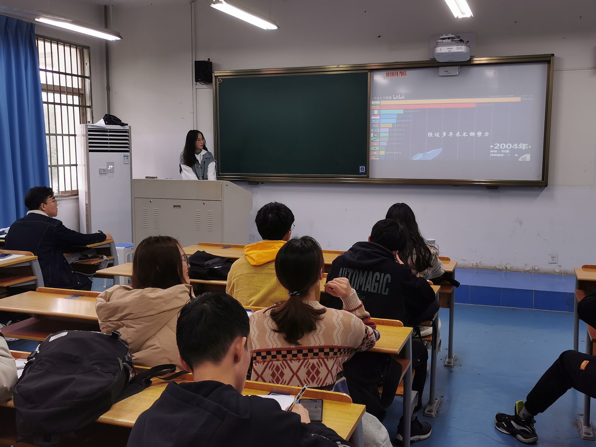首先,韩晨同学通过问题“你心目中的小康社会是什么样?”,引起了同学们对疫情当下小康社会的思考。再以两个视频分析当下中国现状和中国经济所具有的强大韧性与巨大潜力,从而得出“疫情的冲击阻挡不了中国实现全面小康“的事实结论。