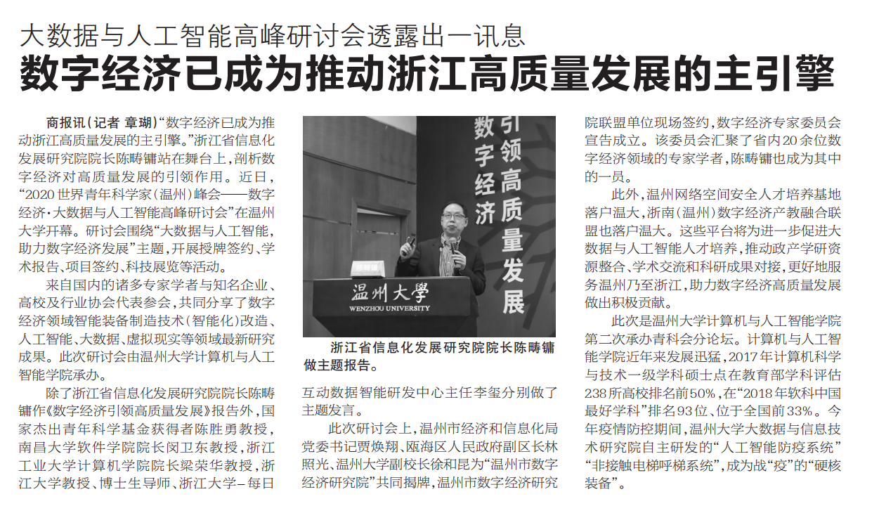 昨天下午,作为2020世界青年科学家峰会重要一环的“数字经济·大数据与人工智能高峰研讨会”在yl23411永利官网登录北校区信息楼报告厅隆重开幕。会上“温州市数字经济研究院”授牌成立,并与其联盟单位项目签约,为20余名数字经济专家委员颁发了证书。温州市数字经济研究院揭牌据悉,数字经济·大数据与人工智能高峰研讨会为期2日,有来自国内的近30余名著名专家学者与会,除了昨天在温大的开幕式外,今天与会嘉宾将转战瑞安多彩科创园,继续...